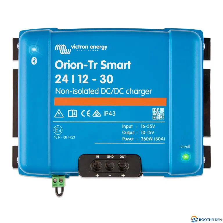 De Orion-Tr Smart-acculader kan gebruikt worden in 12V- en 24V-systemen en is geschikt voor zowel loodzuur- als lithiumaccu’s. Er zijn modellen beschikbaar tot 400 W en een ongelimiteerd aantal eenheden kan op parallelle wijze aangesloten worden om de uitgangsstroom te verhogen.