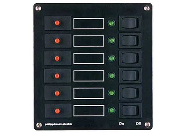 Standaard geschikt voor 12V en 24V. Voorzien van 6 schakelaars en led indicatie. 8A afgezekerd.