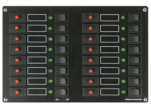 Standaard geschikt voor 12V en 24V. Voorzien van 16 schakelaars en led indicatie. 8A afgezekerd.
