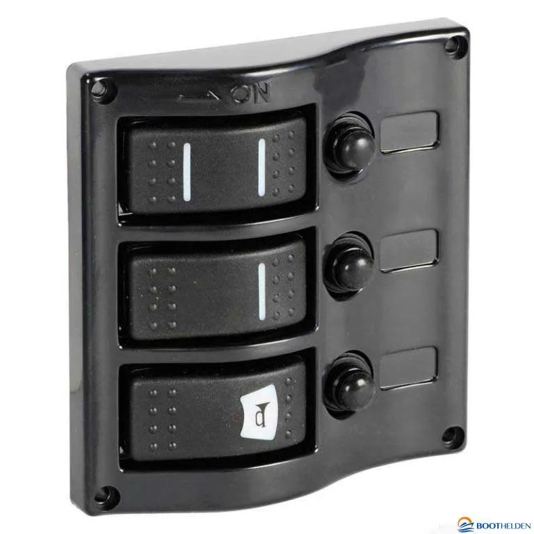 Schakelpanelen met thermische zekeringen en led verlichting.