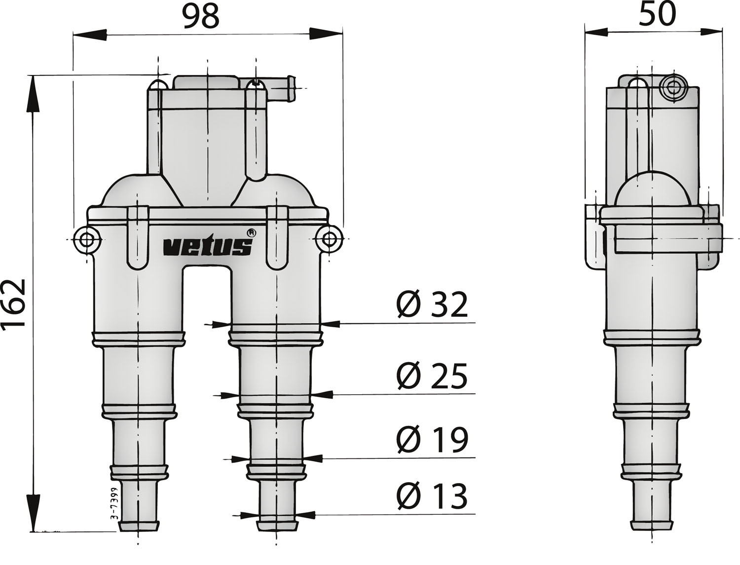 VETUS beluchter met slang, voor 13/19/25/32 mm slang