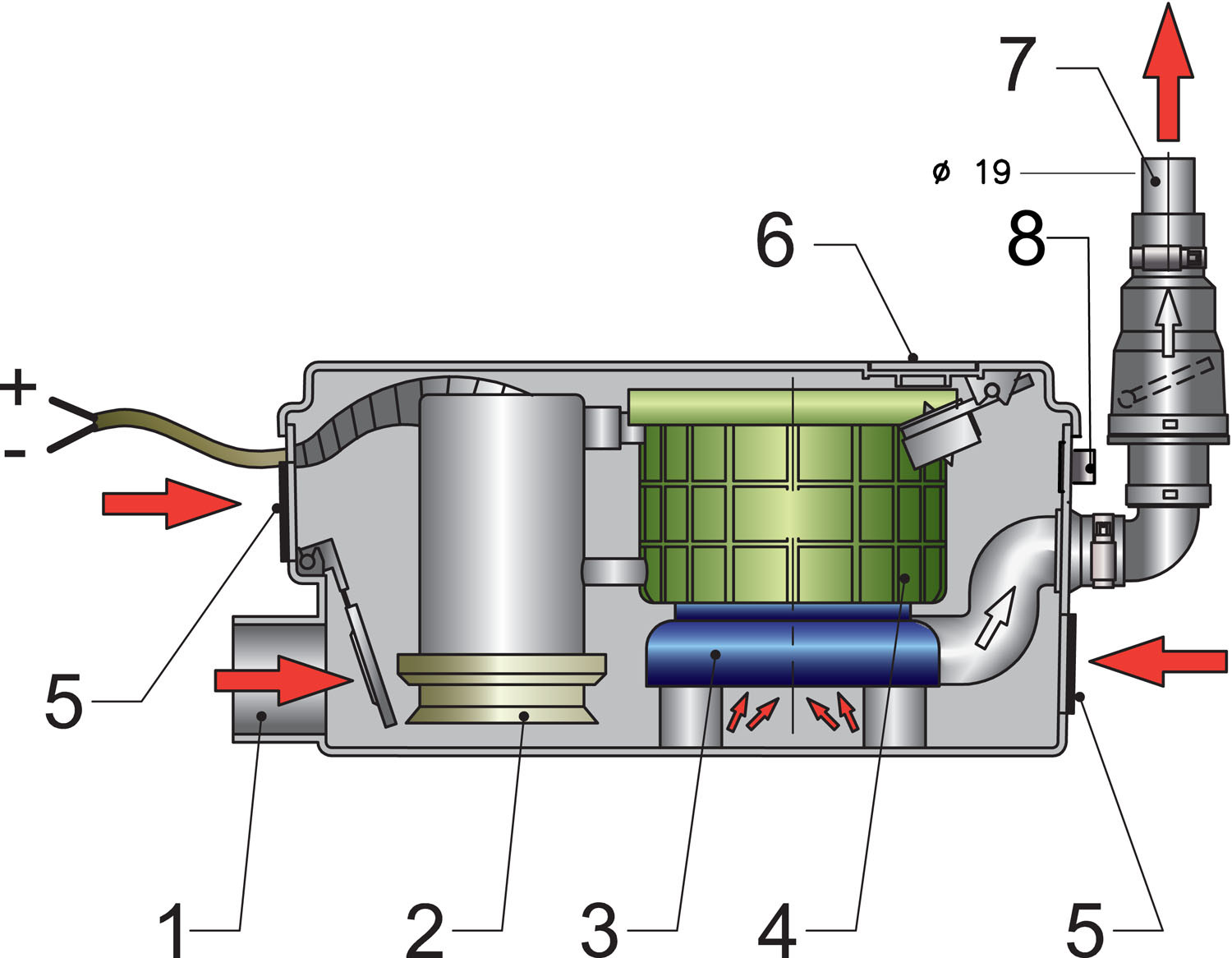 In boten zonder rechtstreekse afvoermogelijkheid pompt het “grijs water afvoersysteem” het afvoerwater moeiteloos weg.