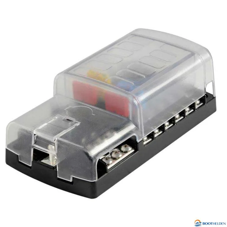 Een vlaksteekzekeringdoos met automatische zekering. 12-voudig. Beschermd met deksel. Beschikbaar in normale en automatische zekering en 6- of 12-voudig.