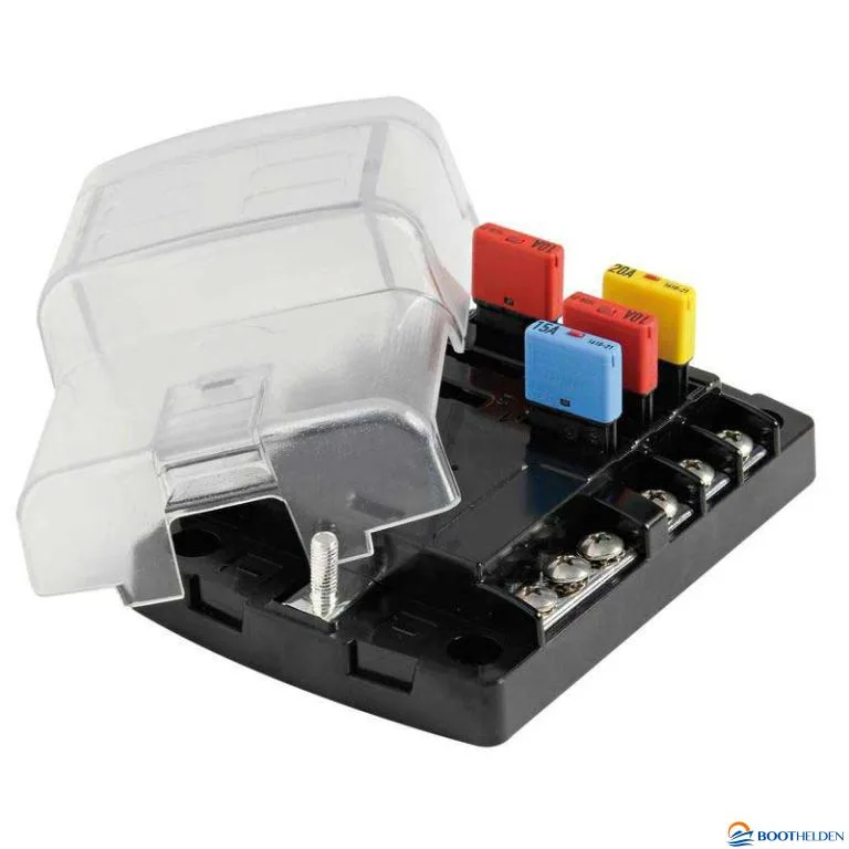 Een vlaksteekzekeringdoos met automatische zekering. 6-voudig. Beschermd met deksel. Beschikbaar in normale en automatische zekering en 6- of 12-voudig.